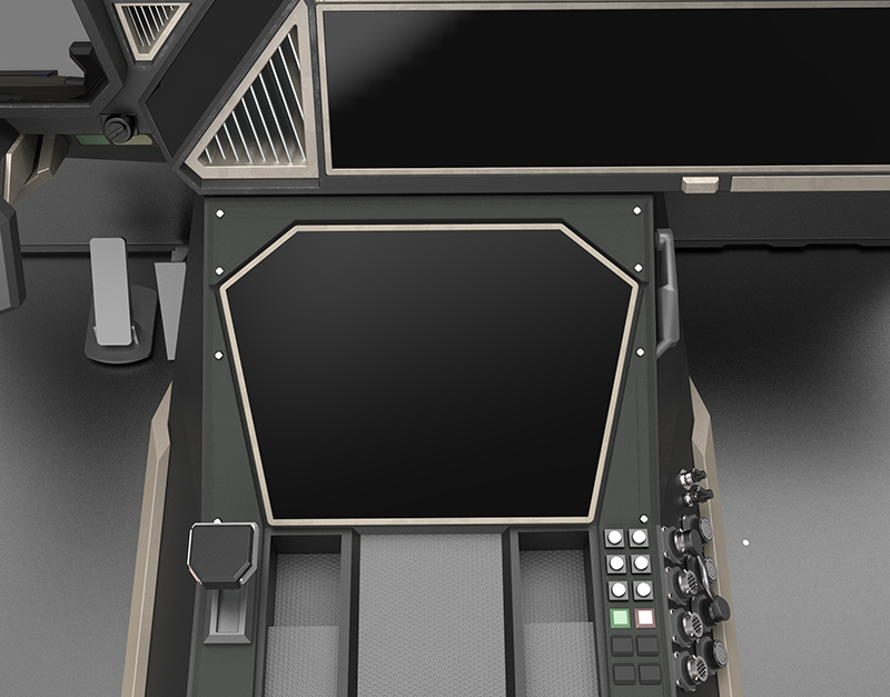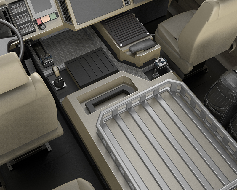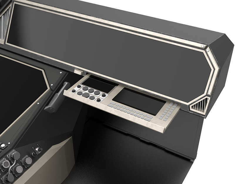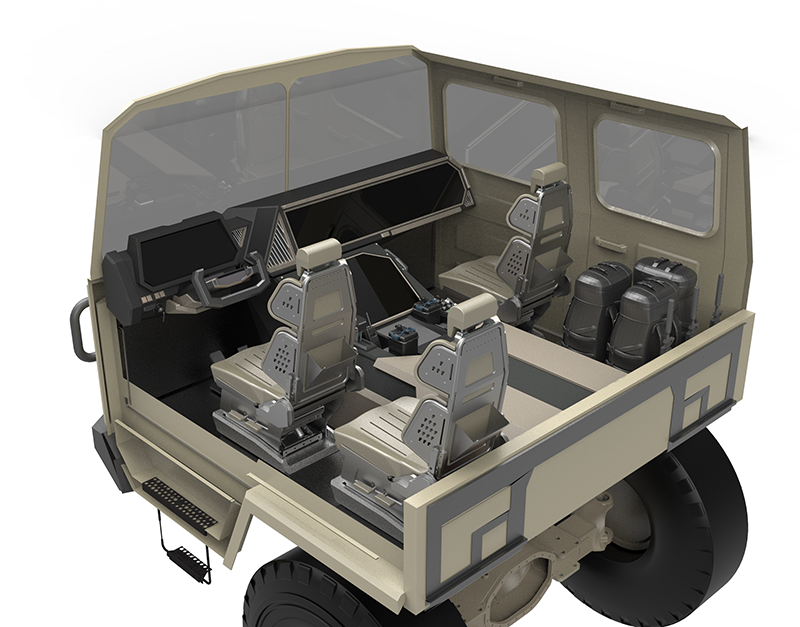 某型号军用特种车辆驾驶室方案系列二为概念设计,在军用特种车辆驾驶室可用性设计原则下,对驾驶室的中央控制台、机舱、操控设备及整体布局进行优化设计。该方案将操作设备与电子设备整合在仪表台与机舱内,并设有可伸缩式武器控制面板,为乘员提供更大的工作空间,提升乘员的操作舒适度。右侧设有盲区辅助显示器,配合车外摄像头可为驾驶员提供更丰富的车辆与路况信息。在武器控制模块部分的设计中,将传统的操控模块转化为贯通式触摸屏幕,加大乘员对战场信息的获取,并提供更多的交互可能性。采用整体性设计语言,将中控与机舱连为一体,在提升视觉效果的同时将设备进一步靠近乘员可达域,提升对空间的利用与操作便捷性。融入多边形设计语言,使得驾驶室整体充满科技感与未来感,增加驾驶室造型美感,有效提升乘员主观满意度。