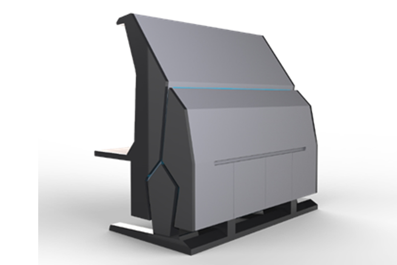 整体采用堡垒式电子雷达造型,象征着防御和进攻兼备,以防御雷达为导向,上部为可伸缩照明灯,灯光可根据环境光源改变自身的亮度,达到不反光、不刺激用户的目的,侧面增加微弱环境灯,颜色主要采用蓝色以及黑色,在稳重大方的基础上又富有现代感、科技感,彰显了空军的气质。下部采用放脚的脚踏板。配备四个主机柜,操控台侧面、顶部及后部散热,侧面增加微弱环境灯;在屏幕设计上,上屏幕采用固定式屏幕,下部3个采用可调节式屏幕,可根据用户的坐姿自动旋转更舒适的屏幕角度。内部采用模块式设计,增加了耐用性,安全性。取消了键盘,采用桌面虚拟键盘,桌面也可以根据人体坐姿有一定的升降。配备储物抽屉,抽屉中存放备用的键鼠套装。