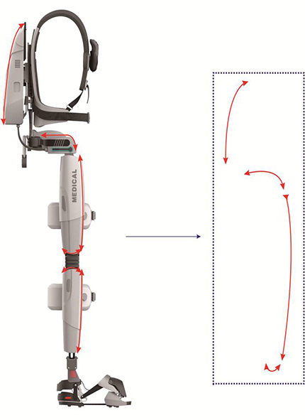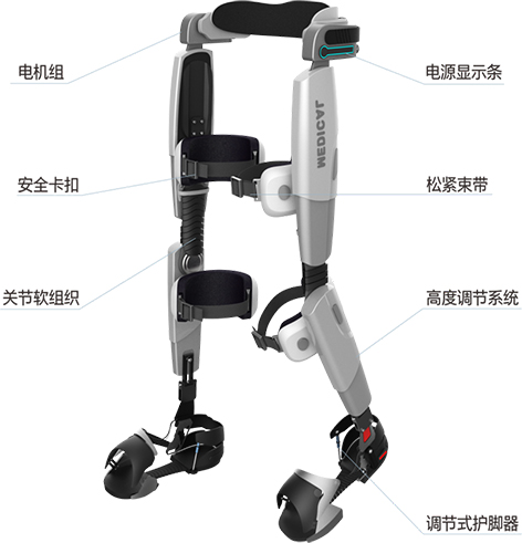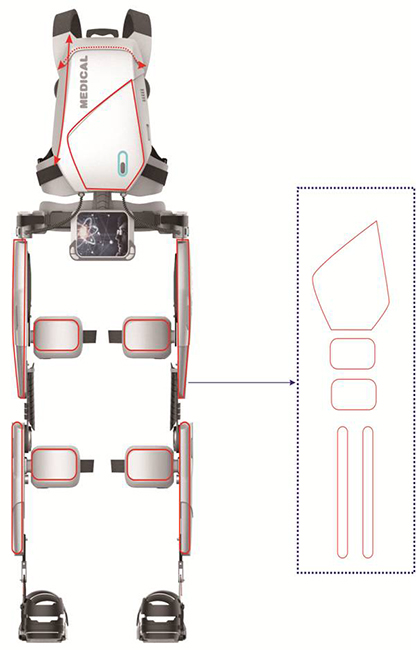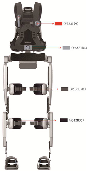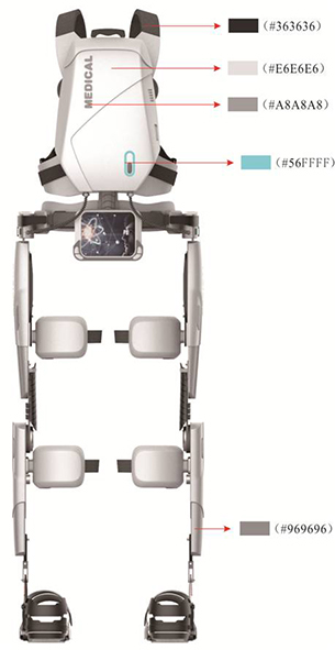 下肢康复外骨骼机器人将造型设计与功能系统相结合,对造型进行合理布局,兼具安全感和轻便感;在贴近人体背部的部位,避免了背部与背包的直接接触,背负与腰带、肩带、腿束采用软质橡胶和尼龙材质的设计,兼具支撑的柔和感和舒适感。在形态上,运用几何面及曲线对动力背包进行整体造型及模块进行分割,突出整体外观设计的简洁感;在分模方式上运用导角处理方式提升整体的精致感。在材质上,选用简洁素净、有质感的整体设计,兼具科技感和耐用感。在色彩上,整体色彩运用以白灰为基调的浅色系,体现出沉稳、柔和的感觉,让病患在使用时,体会到设计者的贴心和其中所传达的人文关怀,更有信心完成康复训练。